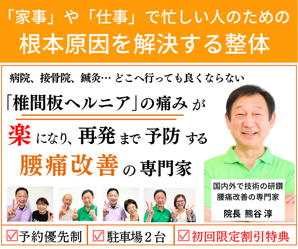 ただし、ヘルニアが起きた原因は普段の生活習慣からくる身体の歪みであることが多く、それを矯正するのには時間がかかります。